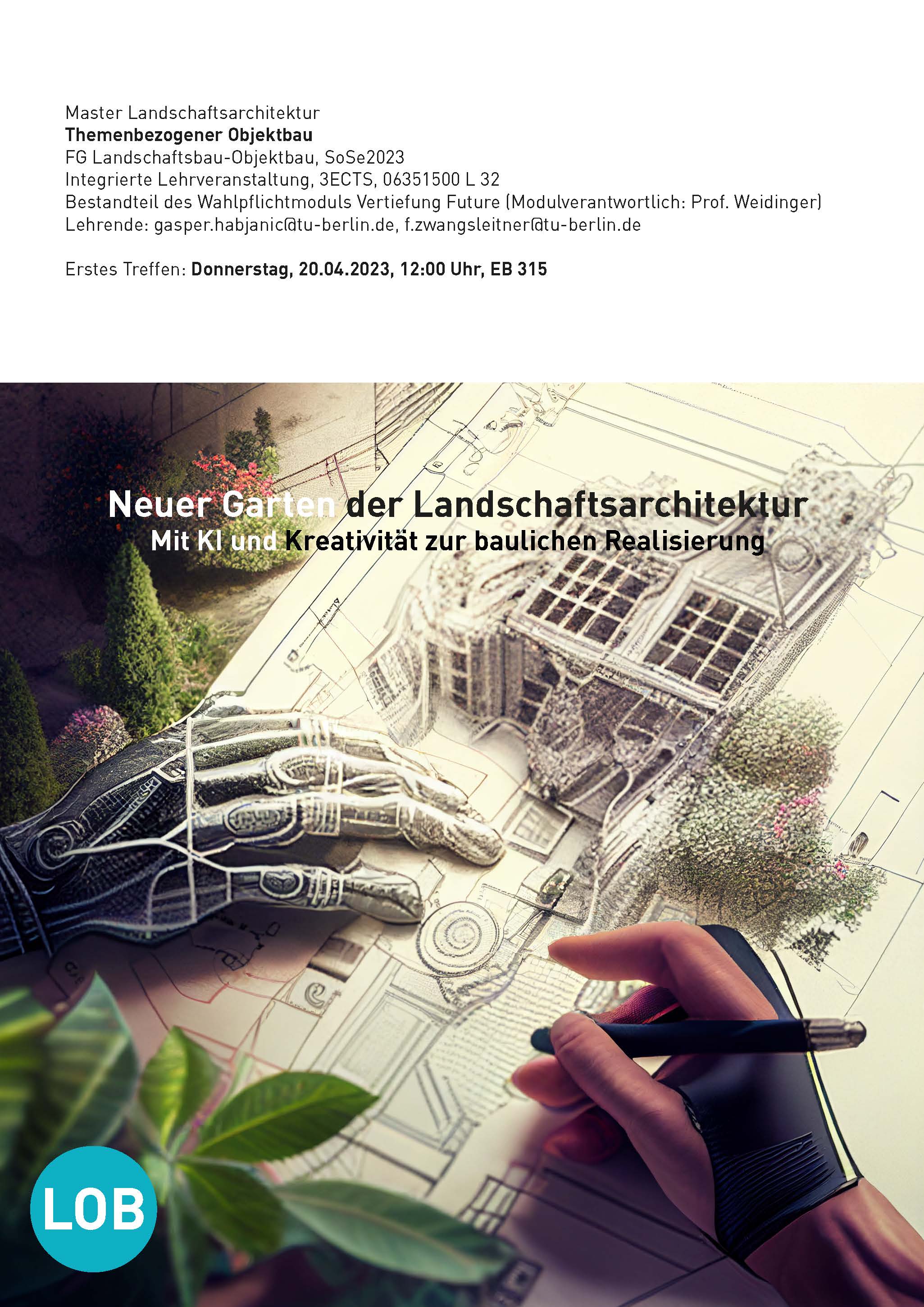 Im Kurs werden von der ersten konzeptionellen Frage "Was ist ein Garten der Landschaftsarchitektur?" bis zum Leitdetails realisierbare Entwürfe für den Garten entwickelt. Der Entwurfsprozess wird mit digitalen und analogen Entwurfswerkzeugen durchführ und von diversen KI Werkzeugen in allen Phasen des Entwerfens unterstützt. Dabei wird der kreative Prozess als Methode für Entwerfen in der Landschaftsarchitektur trainiert und geschärft.