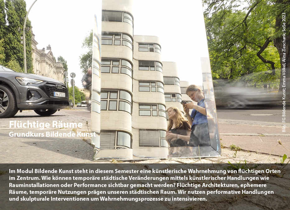Im Modul Bildende Kunst steht in diesem Semester eine künstlerische Wahrnehmung von flüchtigen Orten im Zentrum. Wie können temporäre städtische Veränderungen mittels künstlerischer Handlungen wie Rauminstallationen oder Performance sichtbar gemacht werden? Flüchtige Architekturen, ephemere Räume, temporäre Nutzungen prägen unseren städtischen Raum. Wir nutzen performative Handlungen und skulpturale Interventionen um Wahrnehmungsprozesse zu intensivieren.